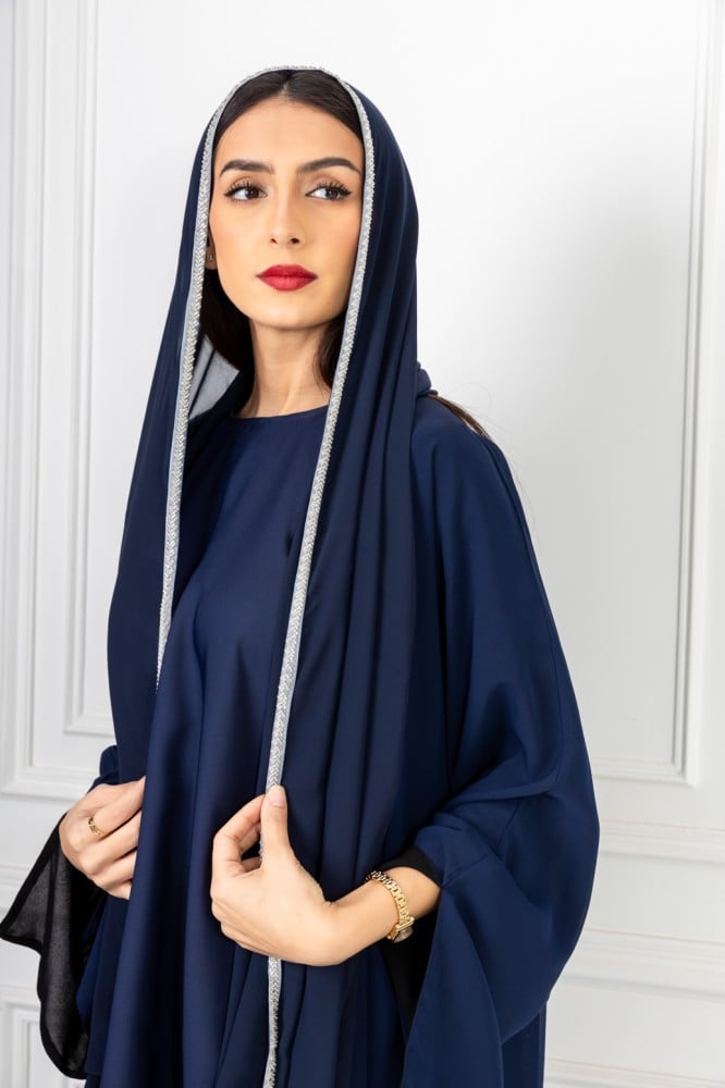 • اللون : كحلي مزين بتطريز فضي أنيق