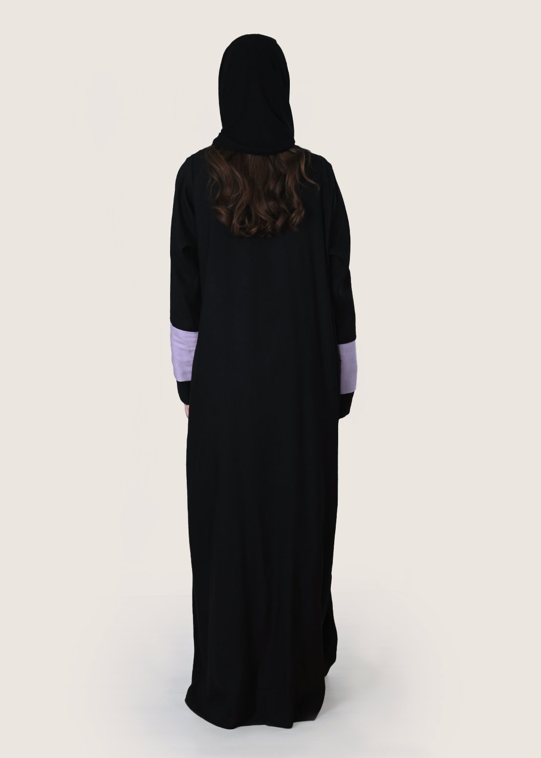 • لون العباية: أسود مع طرحة موف متناسقة