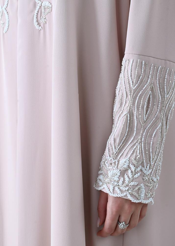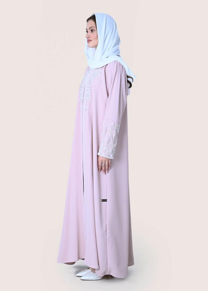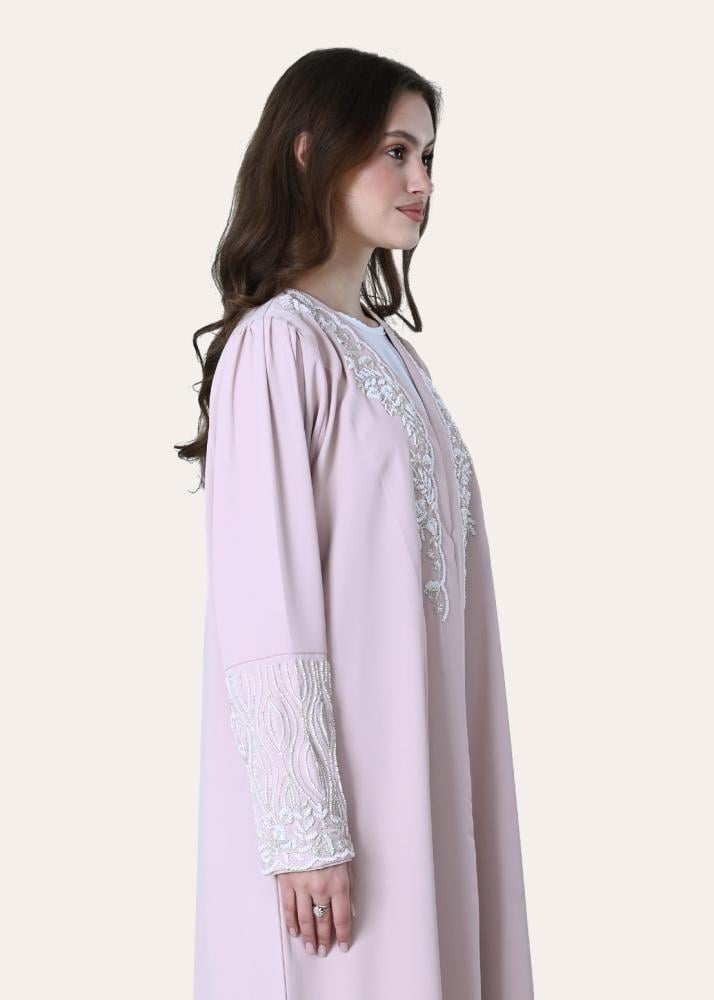 تقدم عباية كلوش كريب التي تحمل اللون الوردي الفاتح خياراً أنيقاً للباحثات عن توازن بين التصميم العملي والمظهر الجذاب. تبرز هذه القطعة من خلال تفاصيل التطريز الناعم على الجهة الأمامية والأكمام، ما يمنحها طابعاً فريداً دون التخلي عن الراحة بفضل قماش الكريب الخفيف والفضفاض.