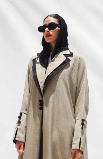 تنسيق اللون النبيتي مع الرصاصي من الأمور الشائعة التي تناسب اللون الرصاصي في الملابس للمحجبات