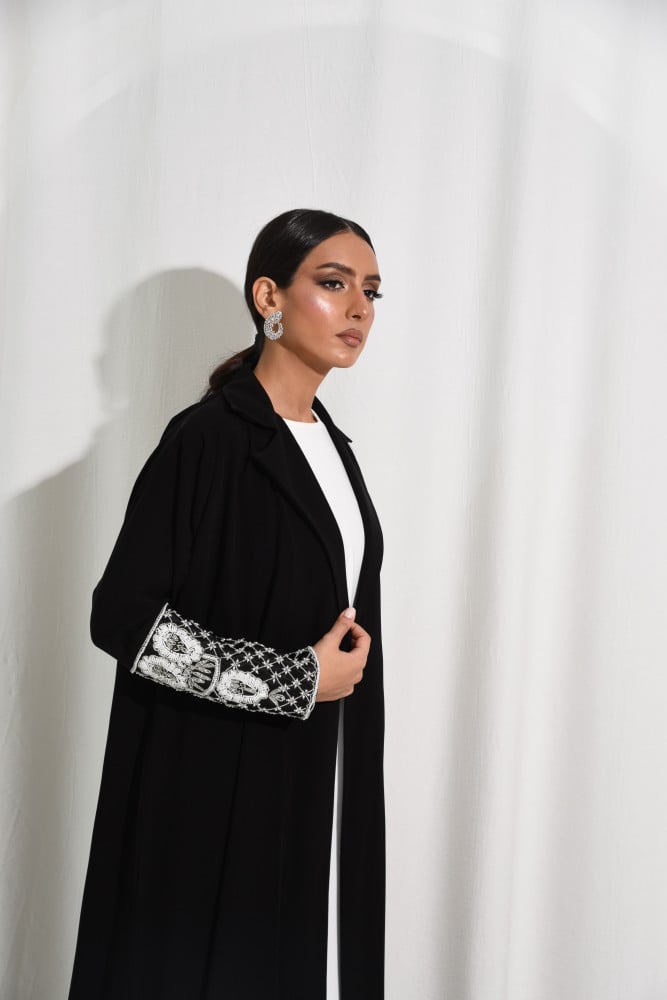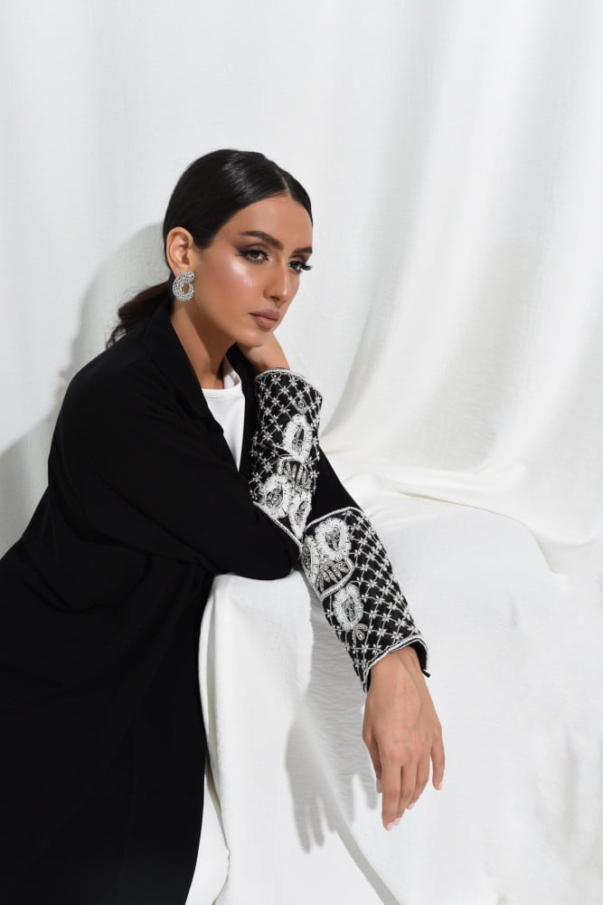 مميزات الخامة :يتميز بلونه الأسود الفاحم ونسيجه الناعم خفيف الوزن، ويتميز بقدرته الحفاظ على شكله ولونه جيداً ،مما يجعل العباية تبدو أنيقه ومتألقه دائما.