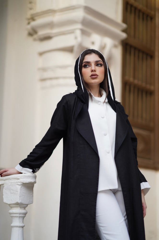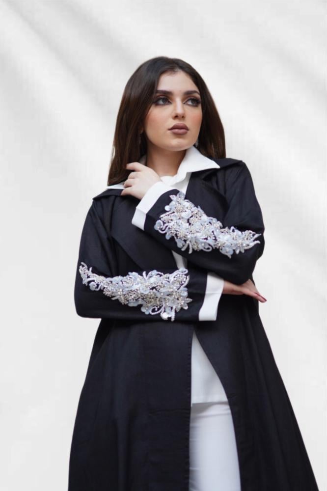 L014- عباية لينين أسود مع بليزر ثابت - تطريز .