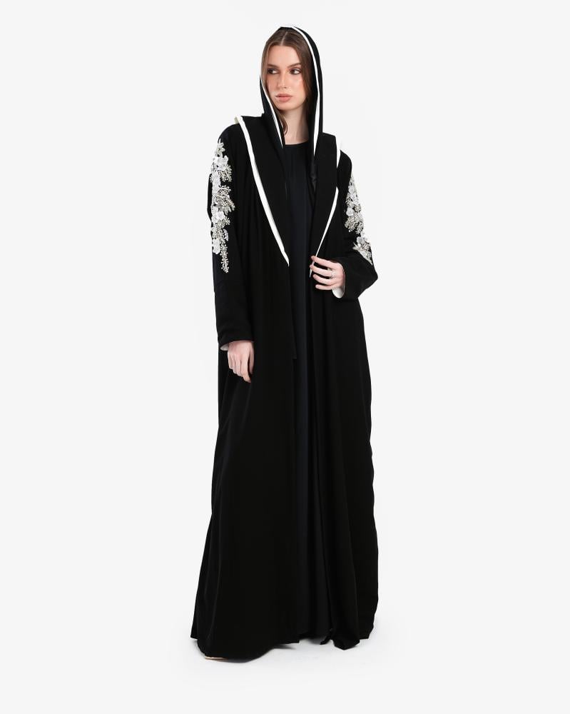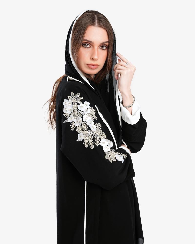 مميزات الخامة :يتميز بلونه الأسود الفاحم ونسيجه الناعم خفيف الوزن، ويتميز بقدرته الحفاظ على شكله ولونه جيداً ،مما يجعل العباية تبدو أنيقه ومتألقه دائما.