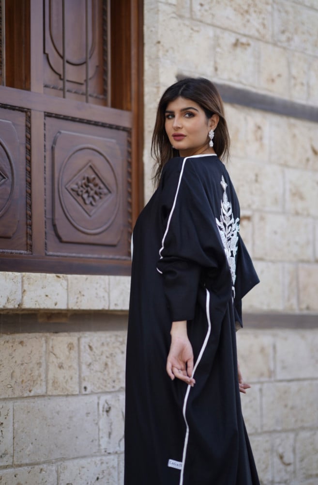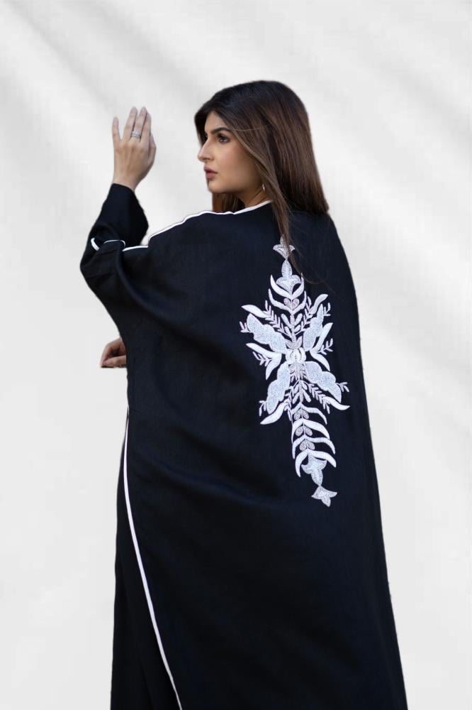 L027 - عباية اسود قصت بشت شك يدوي من الخلف قماش لنن طبيعي