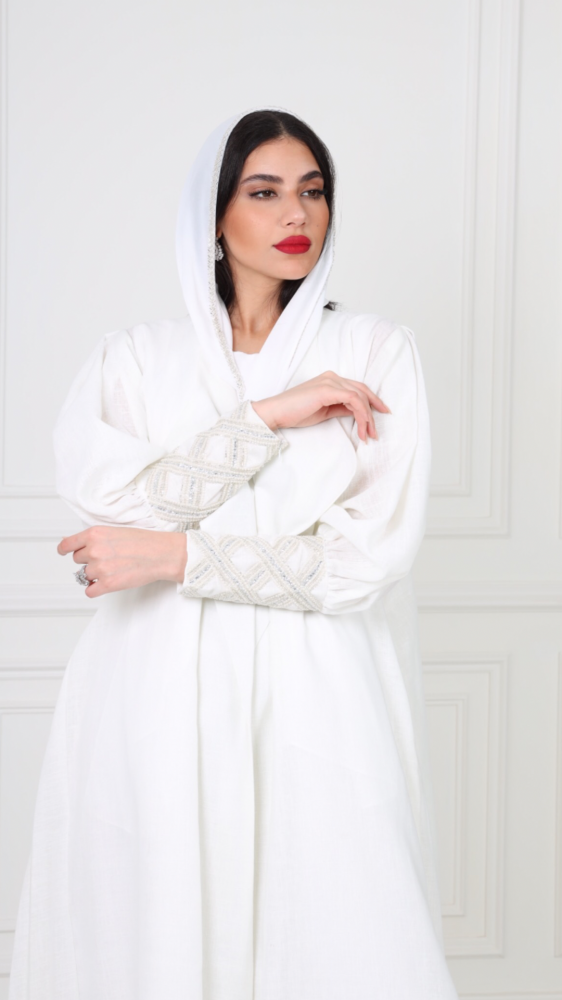 L054 - عباية لينين ابيض - كسرات جانبيه - تطريز .