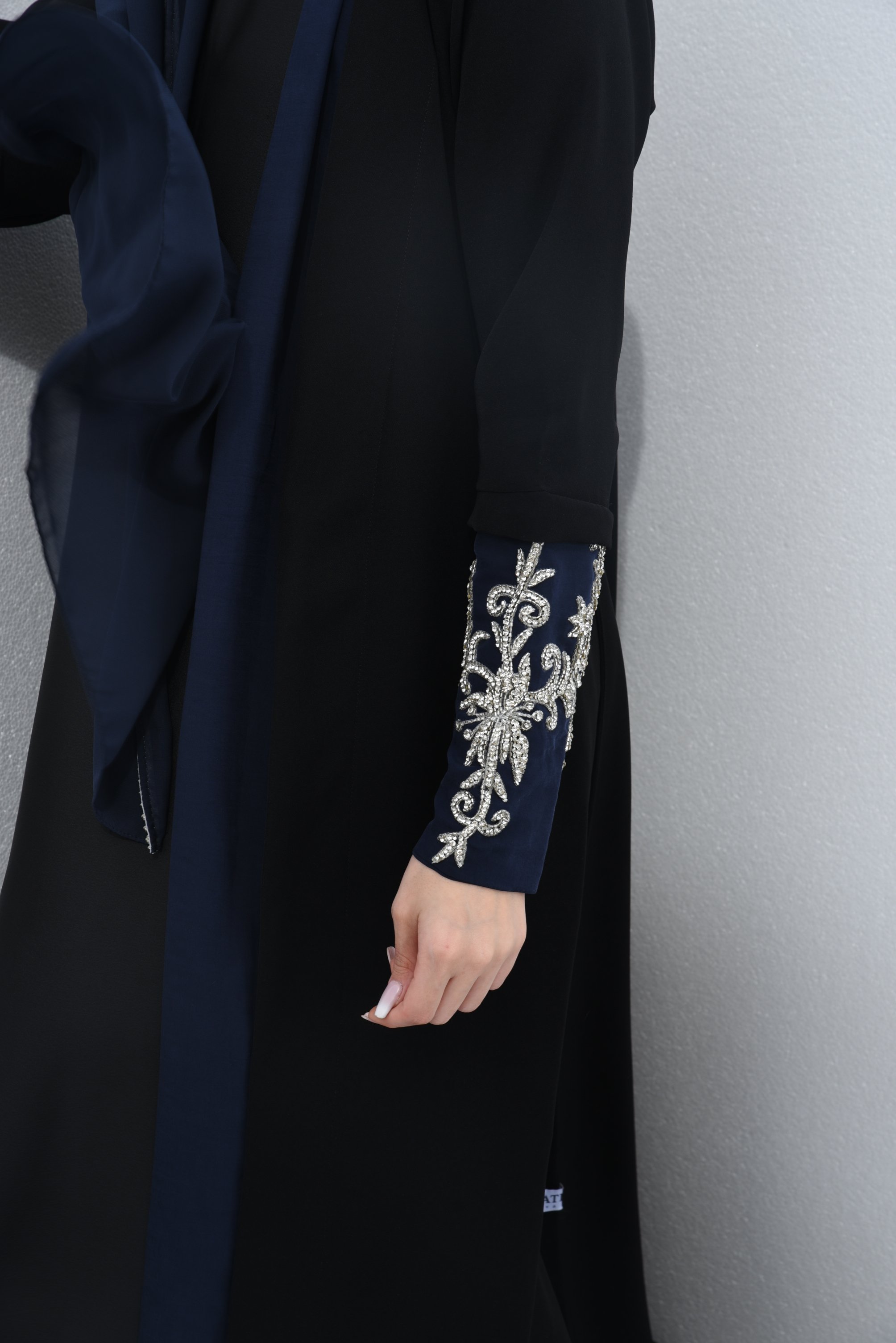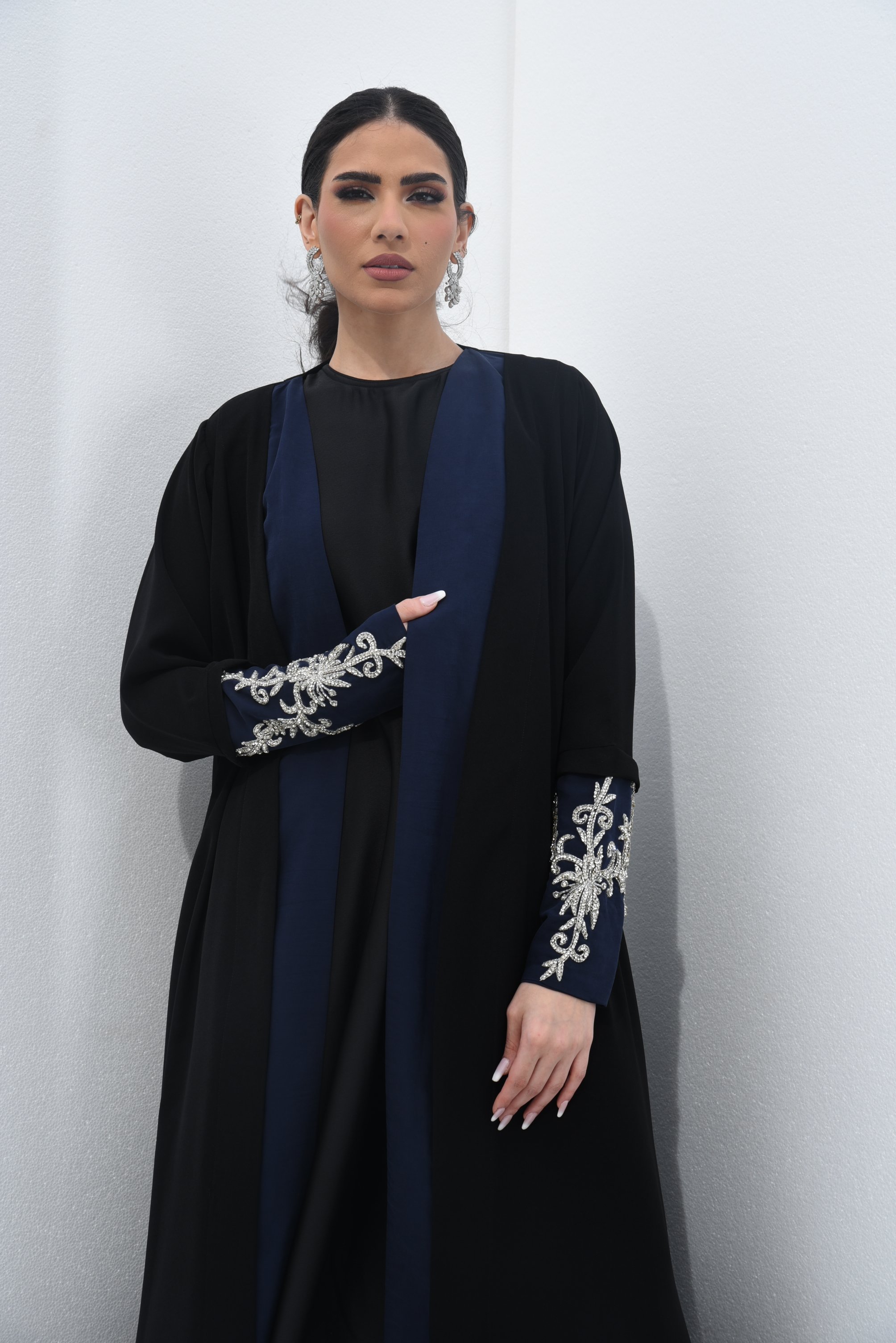 عباية قماش حرير مصممة بعناية لتجمع بين الأناقة العملية والراحة. تم تنفيذها باستخدام الكريب مع الحرير المغسول ليظهر القماش بشكل انسيابي وراقي. اللون الأسود يمنح التصميم حضوراً قوياً، بينما تأتي الأكمام بأساور مطرزة تضيف لمسة فنية واضحة، لتصبح القطعة مناسبة للاستخدام اليومي وأيضاً للحفلات والمناسبات الخاصة.