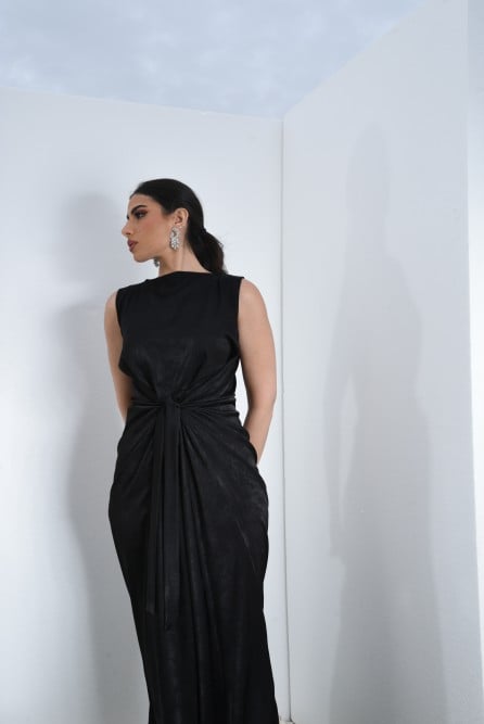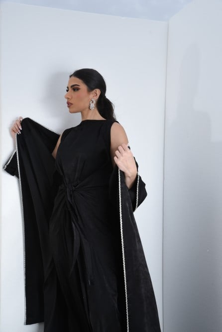 L104 - عباية مع فستان حرير مغسول أسود - تطريز كرستال .