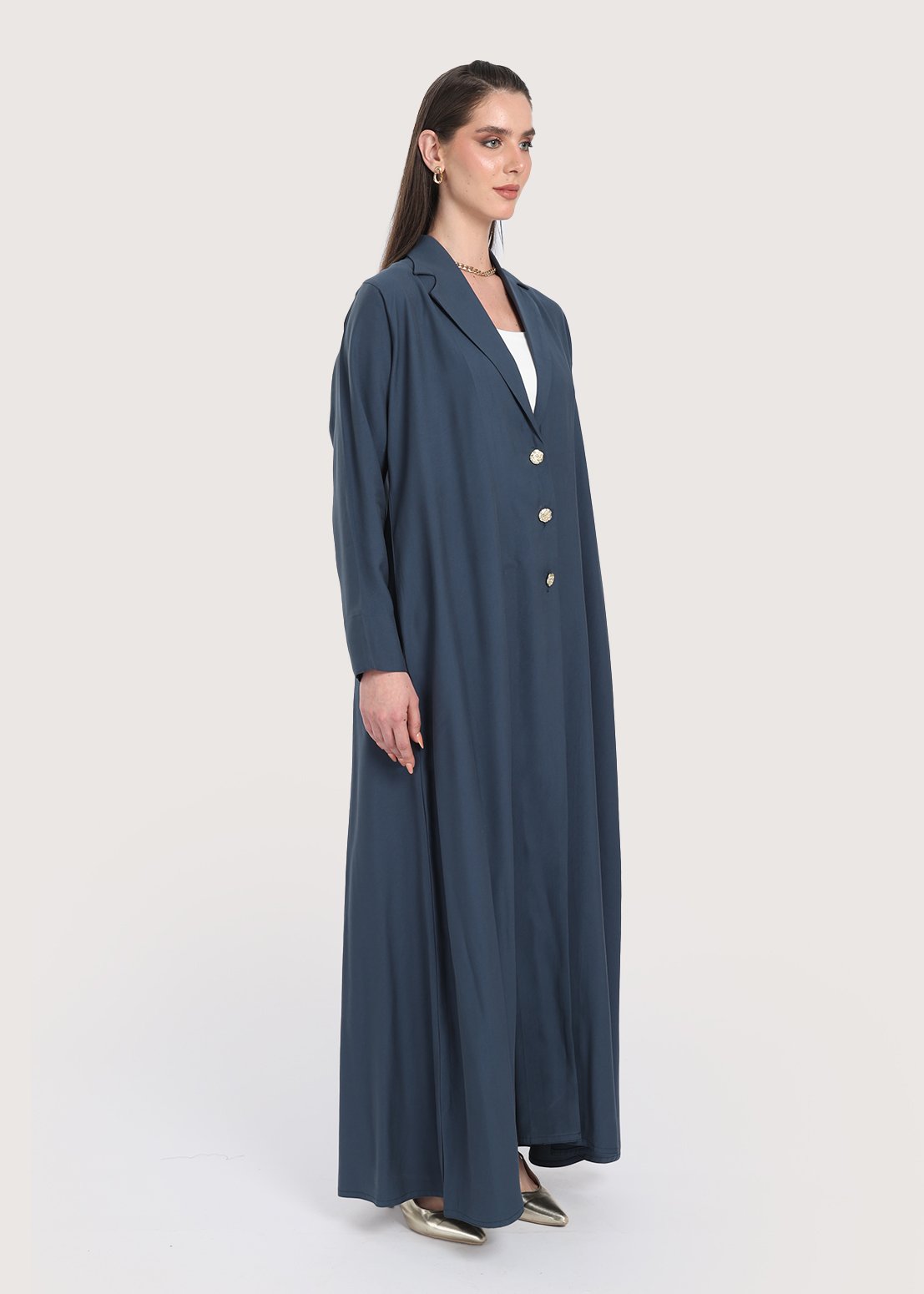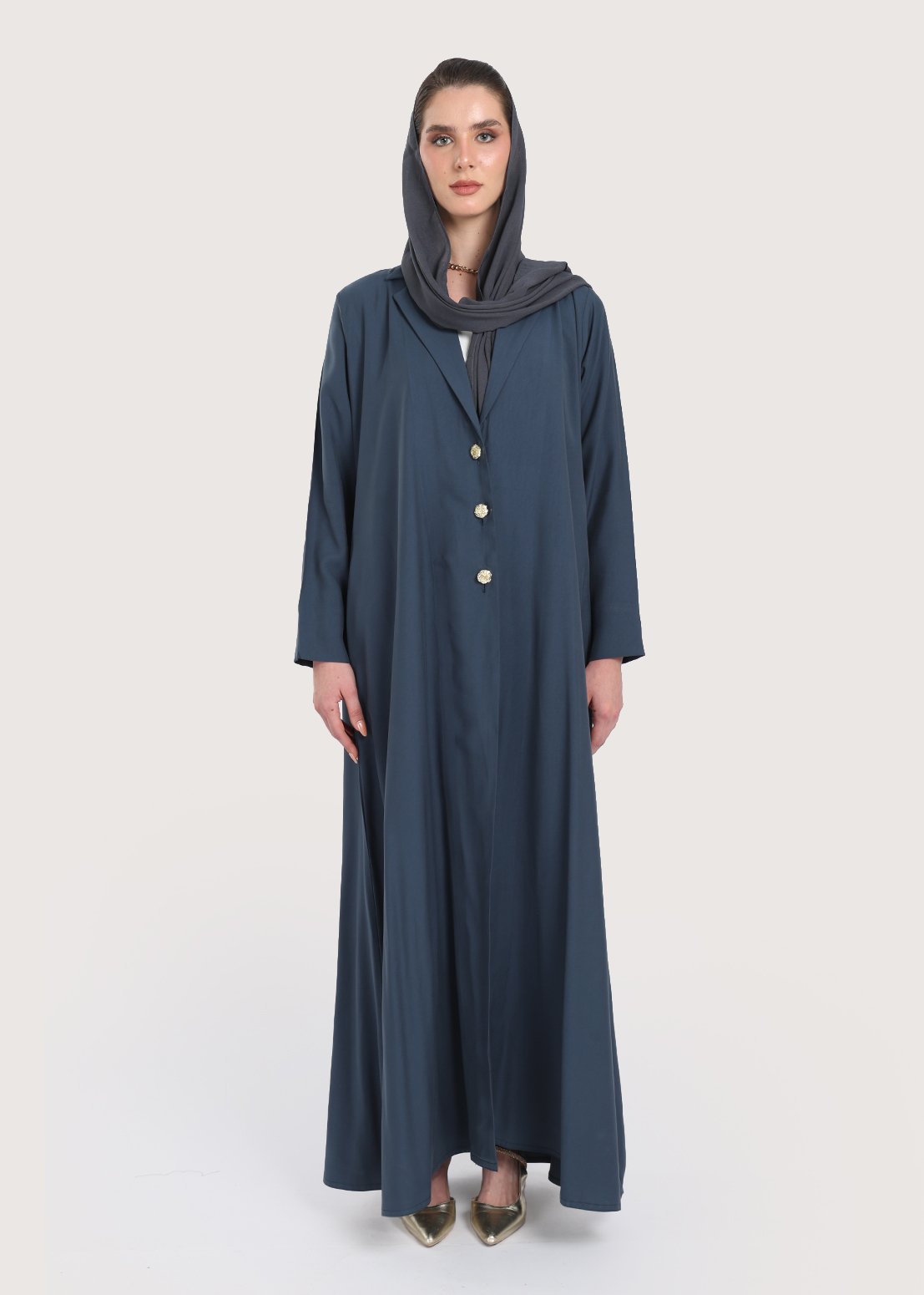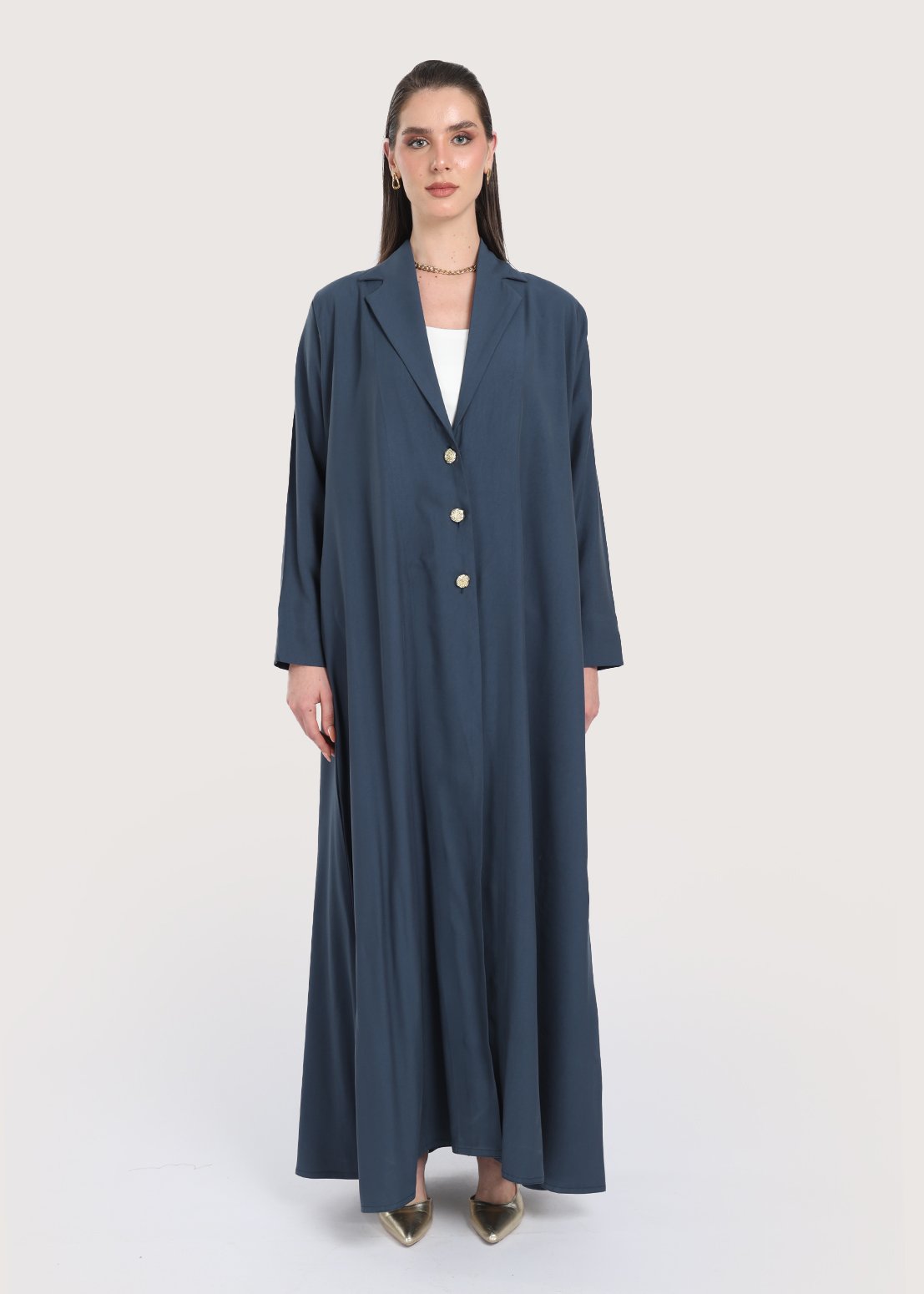 تصميم عصري يناسب مختلف الأوقات يظهر في هذه العباية بليزر ذات اللون الأزرق وخامة الكريب الفاخرة. يجمع التصميم بين الراحة والأناقة من خلال قصة مستقيمة واسعة قليلاً من الأسفل وزينة الأزرار الذهبية الأمامية. الخامات المختارة والعناية بتفاصيل الياقة تمنح ارتداء العباية طابعاً عملياً وفخماً مع الحفاظ على لمسة الأنوثة، ما يجعلها ضمن الخيارات العملية والملفتة عند الحديث عن عباية بليزر في السوق.