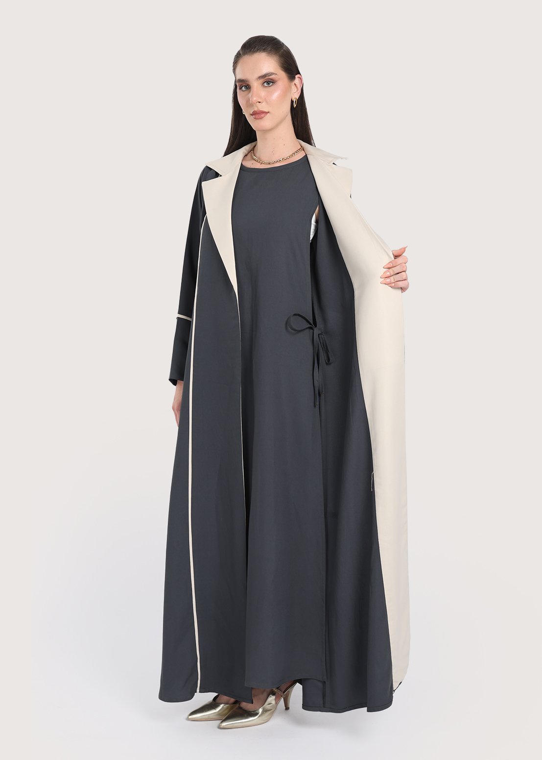 - لمسات البيج الدقيقة على الأطراف تبرز جمالية العباية وتضيف بعداً عصرياً للتصميم.