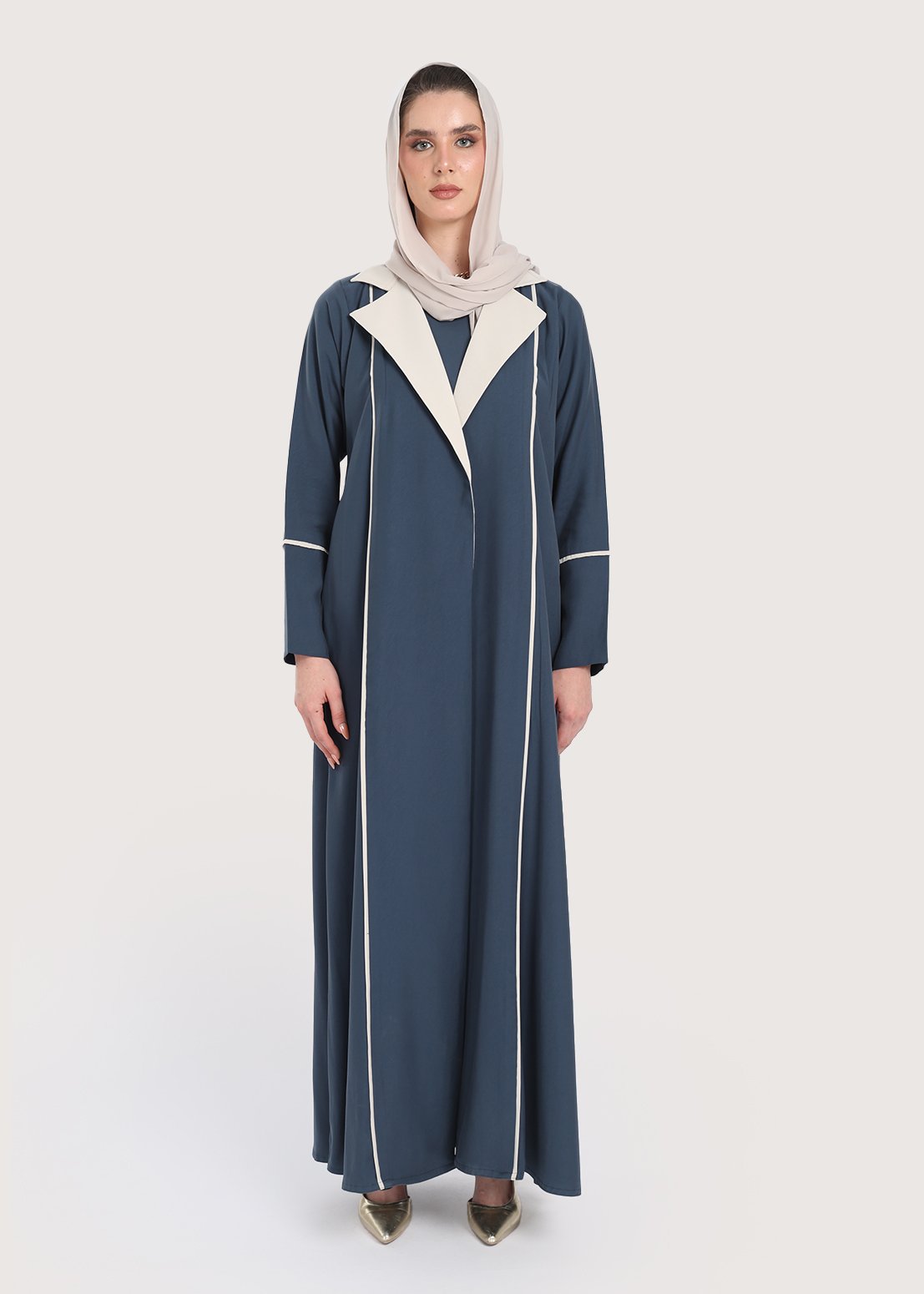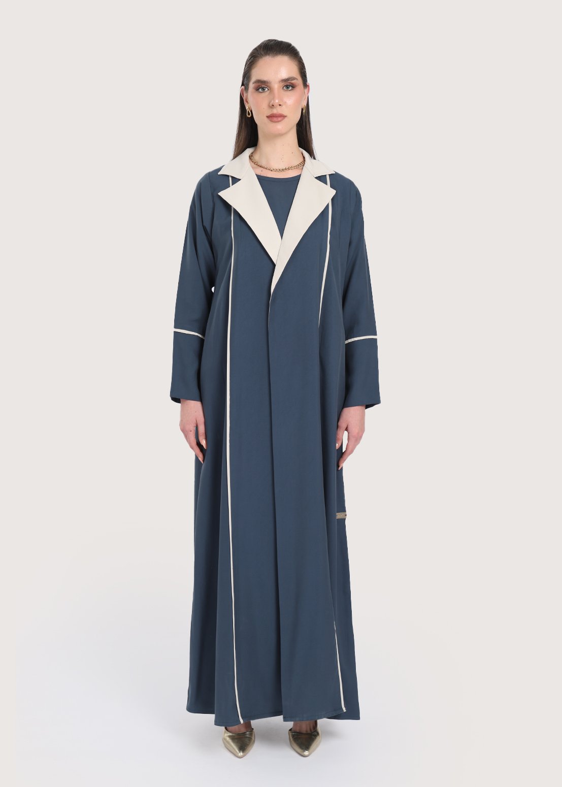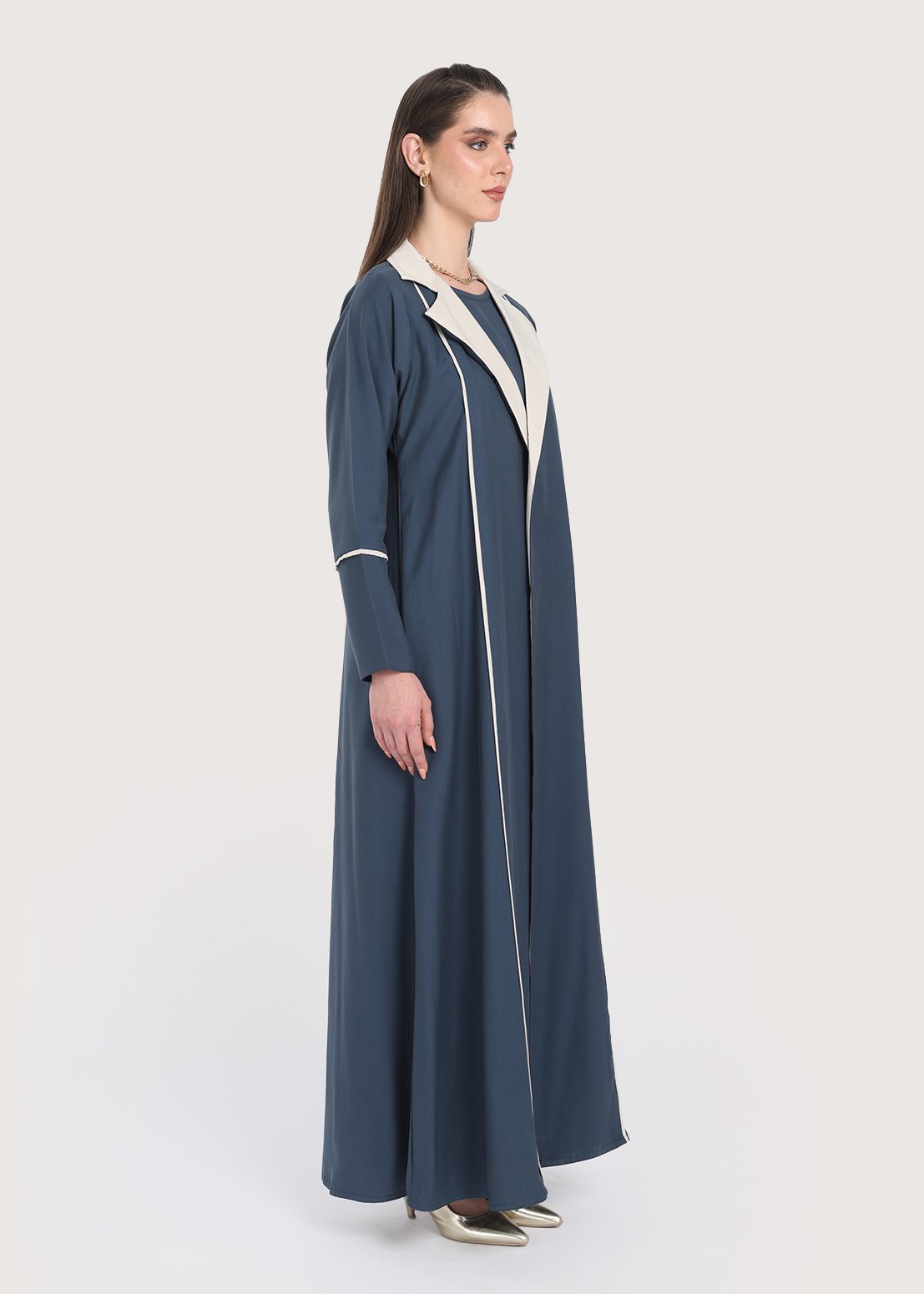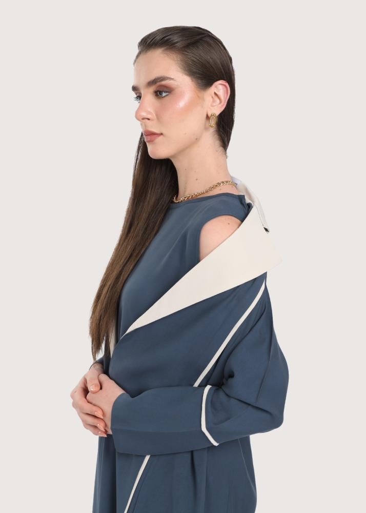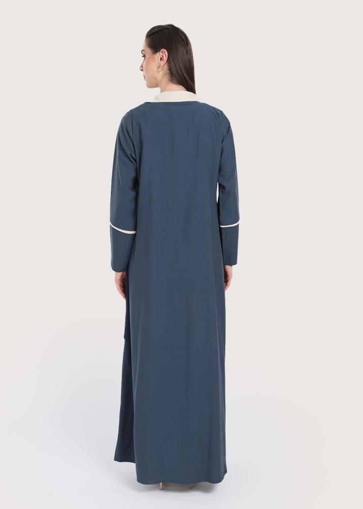 تجمع عباية لون ازرق بين المظهر العصري والتصميم العملي، حيث تبرز بتداخل اللون البيج على الياقة لإضفاء طابع متجدد، تتميز العباية بفستان ثابت تضفي طابعاً محتشما، صُنعت عباية ازرق من قماش كريب ناعم يمنح ملمسًا هادئًا على البشرة ويتيح حرية الحركة طوال اليوم، تناسب القصّة الرسمية مختلف المناسبات، وتوفر الأكمام الطويلة حضورًا متوازنًا وراقيًا في اللقاءات أو الفعاليات الخاصة.