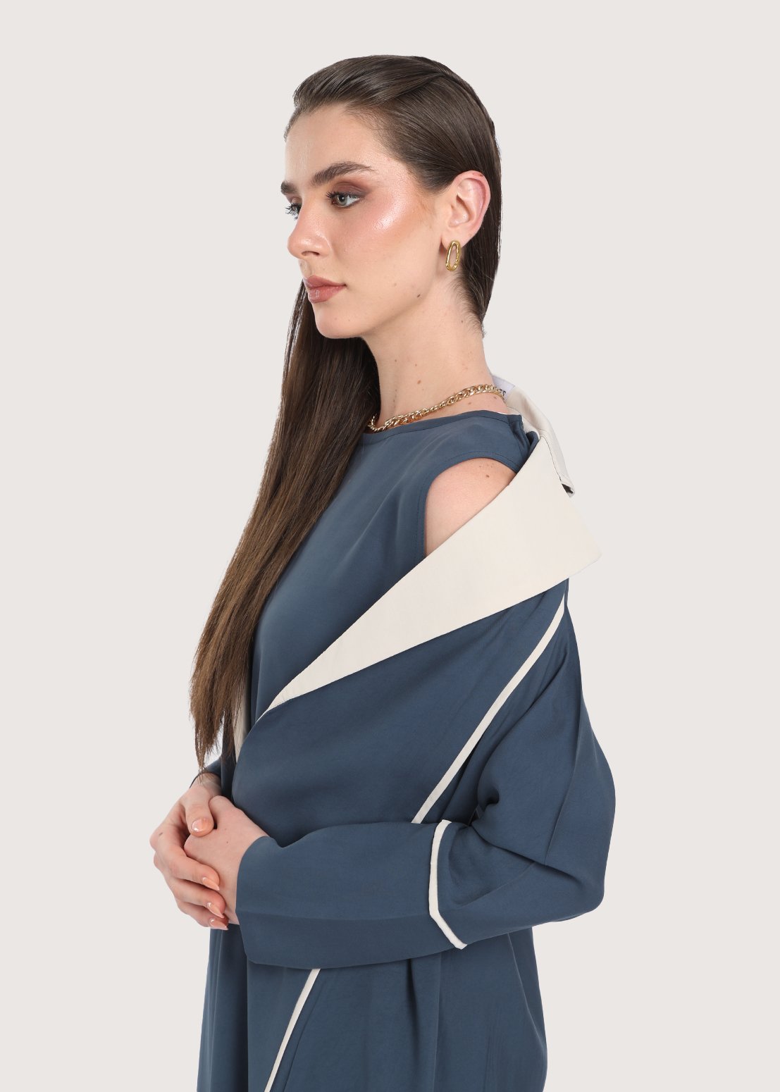 - التصميم: قصّة A-cut فضفاضة وياقة بتداخل اللون البيج
