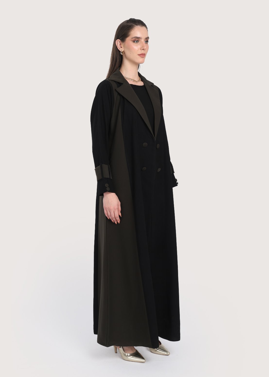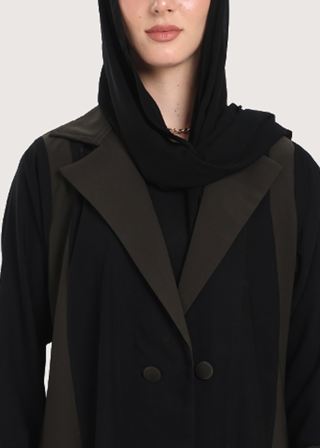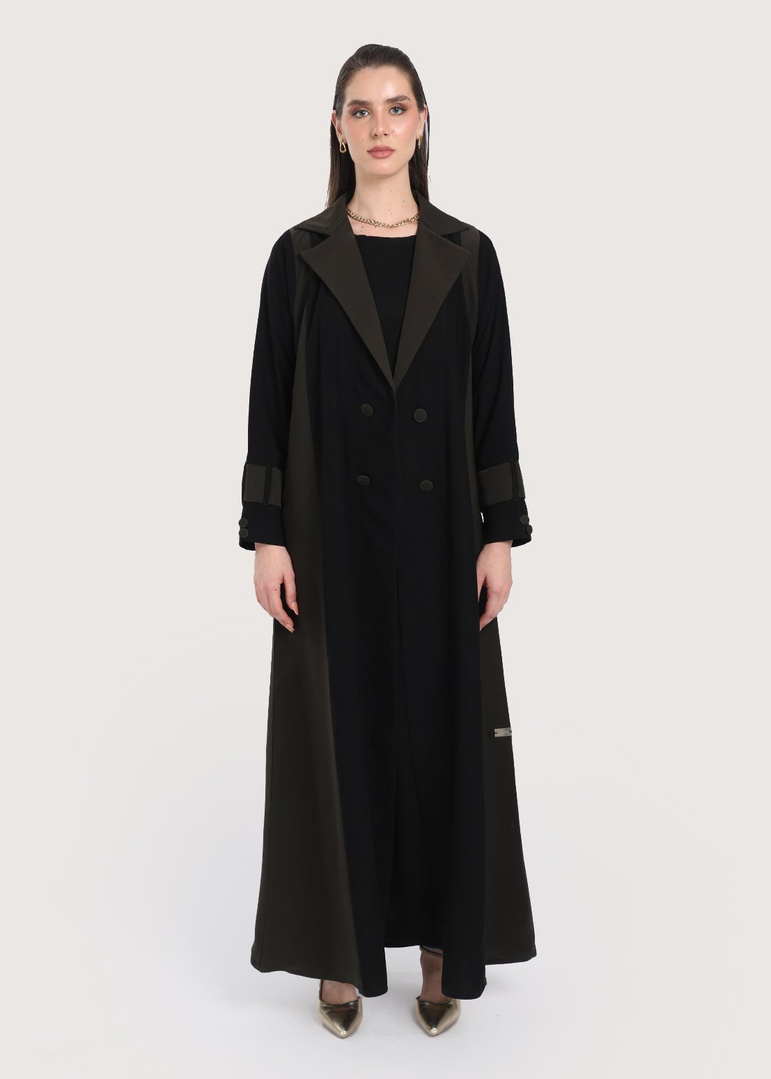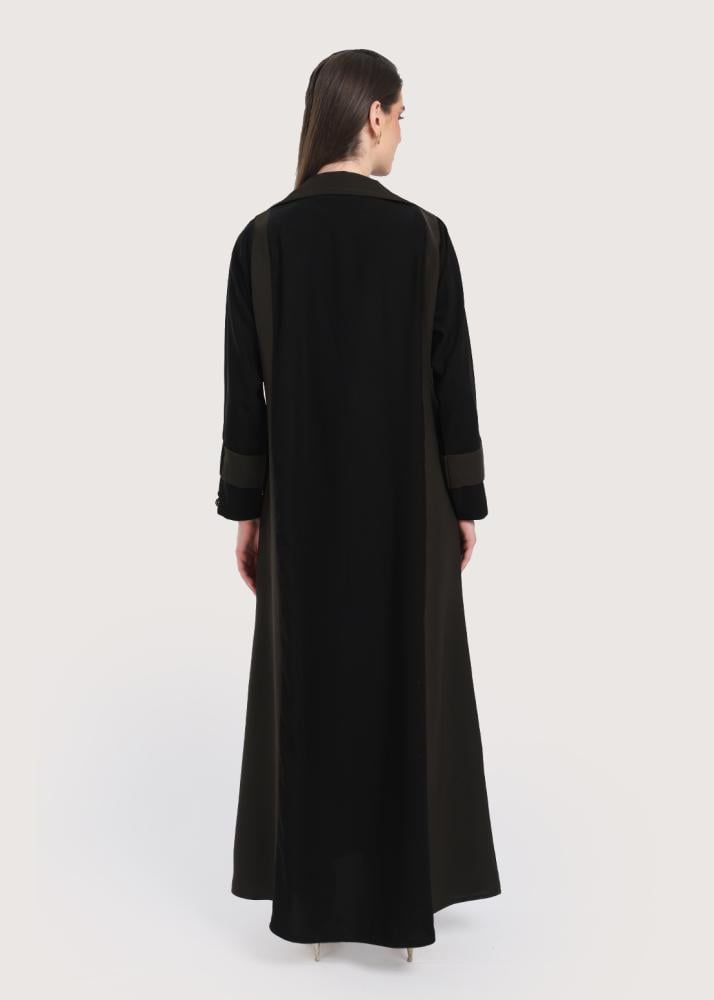 - الأزرار الأمامية المزدوجة تسهل ارتداء العباءة وتقدم جانباً عملياً، مع الحفاظ على طابعها العصري.