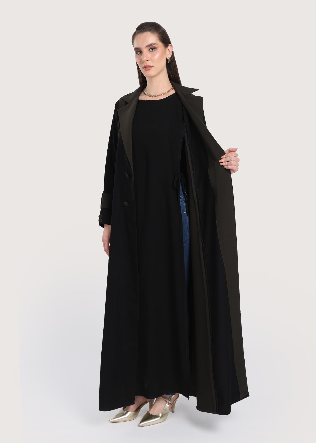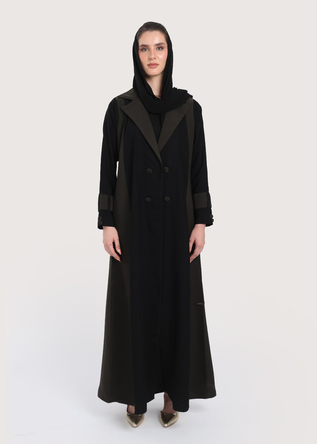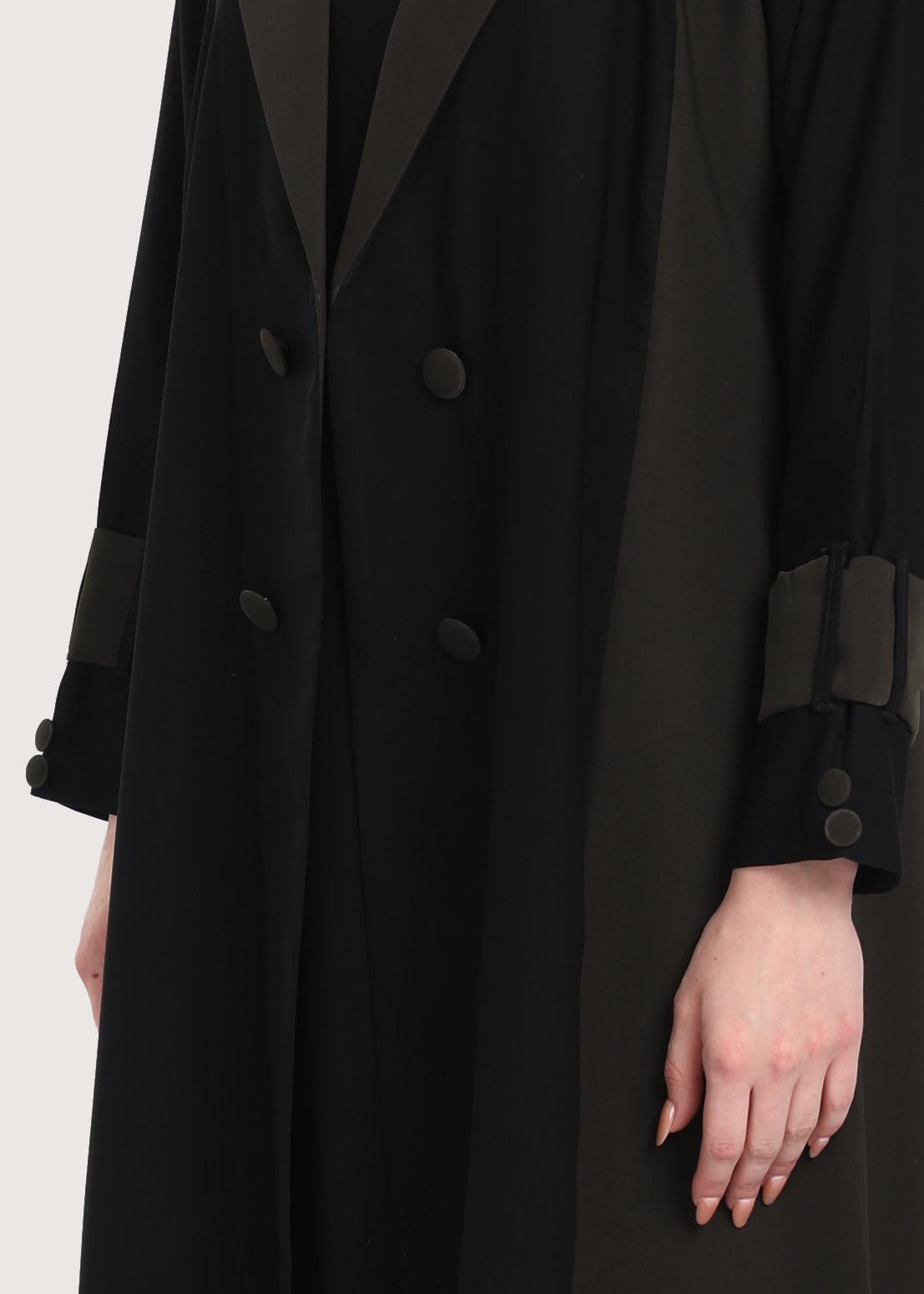 - الأزرار الأمامية المزدوجة تسهل ارتداء العباءة وتقدم جانباً عملياً، مع الحفاظ على طابعها العصري.
