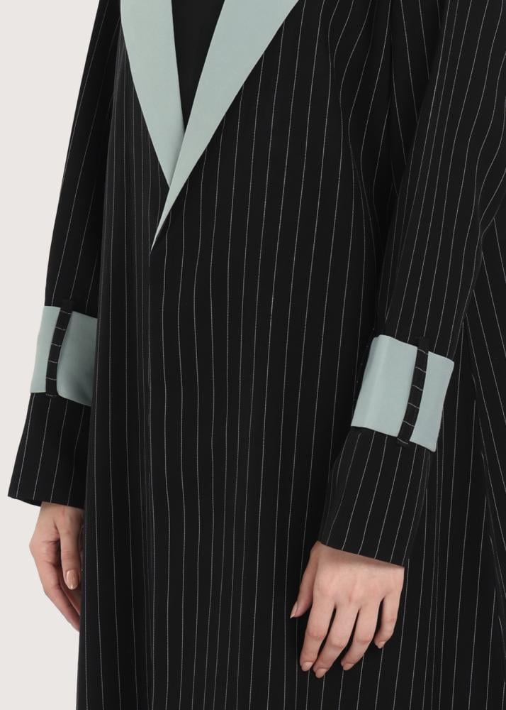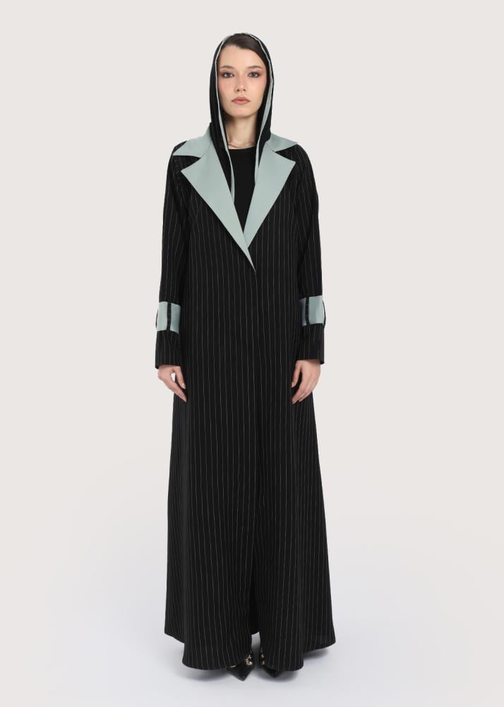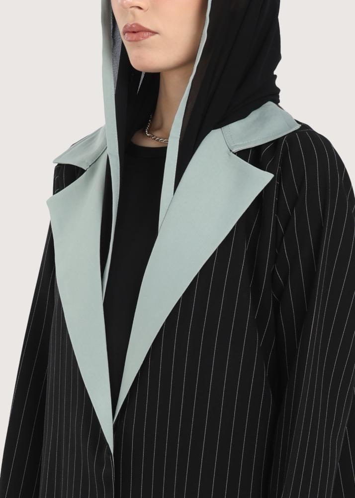 تجمع هذه القطعة بين لمسات الأناقة والخطوط العملية، حيث تقدم عباية جاكيت رسمي تجربة متوازنة من الراحة والتميز في اللبس، مصنوعة من كريب مقلم يضفي مظهراً رشيقاً، ويمنح القوام إحساساً بالثقة والرقي، ما يجعلها ملائمة للأوقات العملية واللقاءات الرسمية دون عناء في التنسيق.