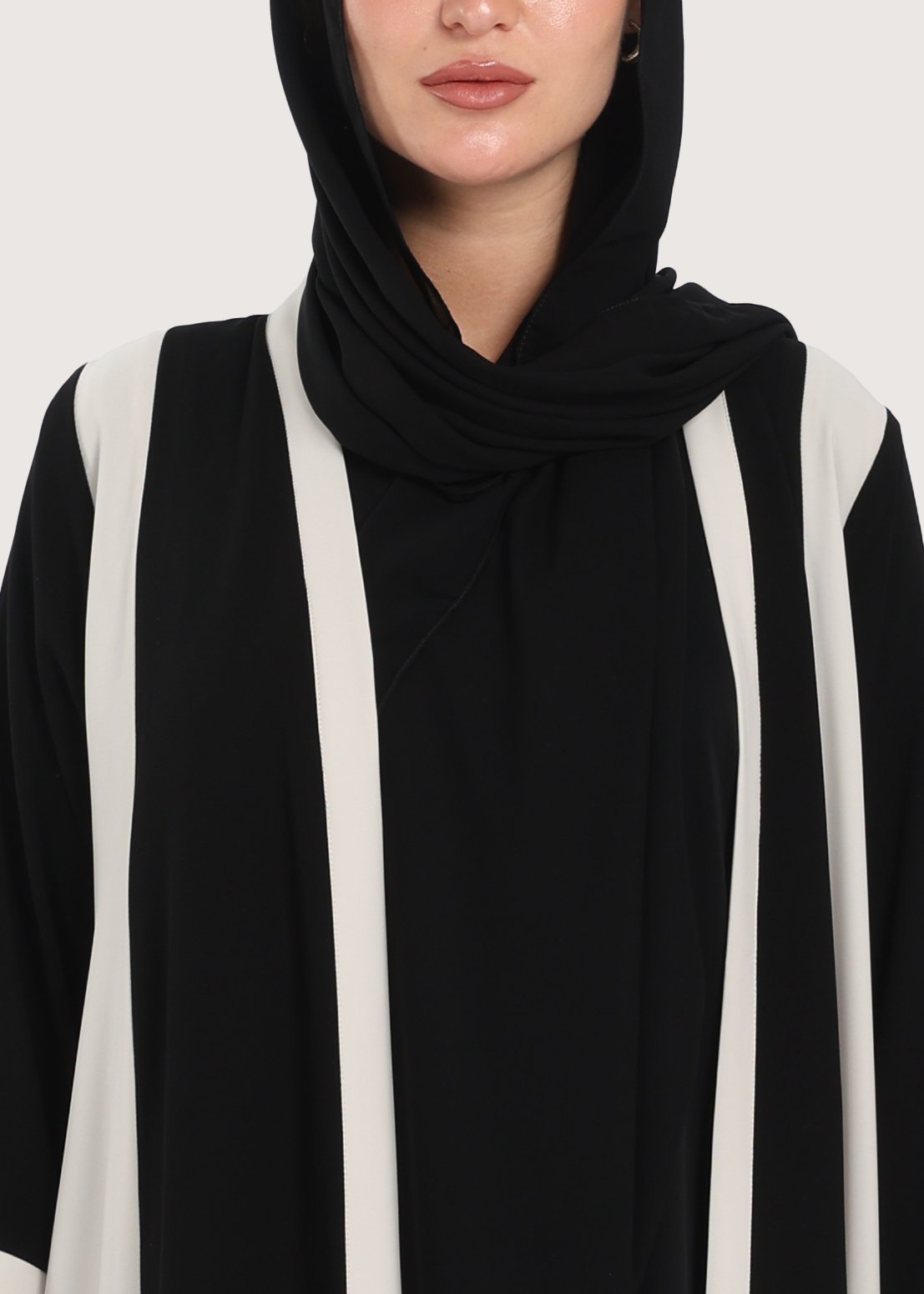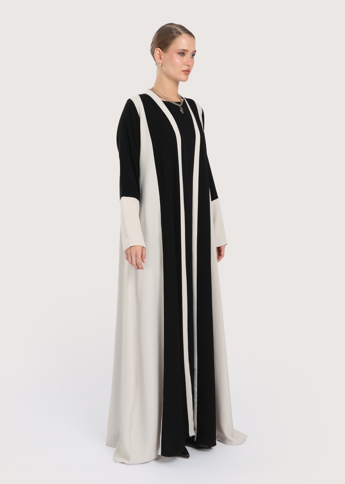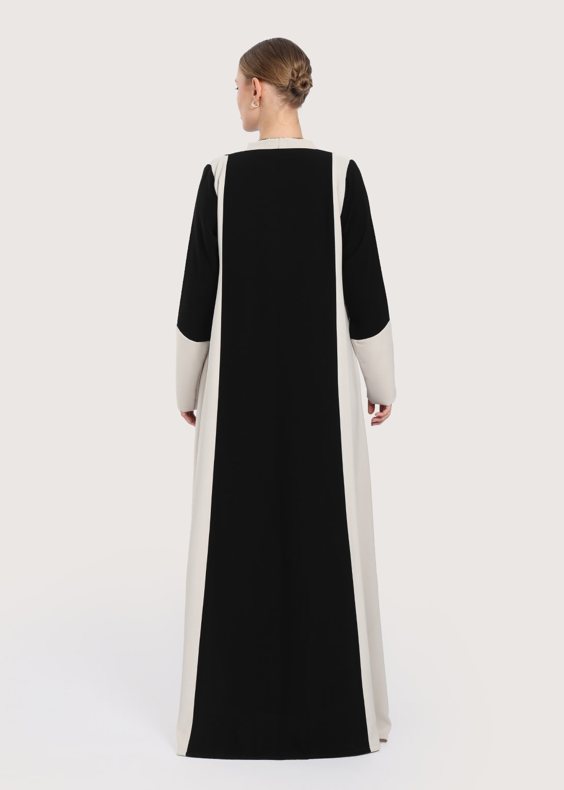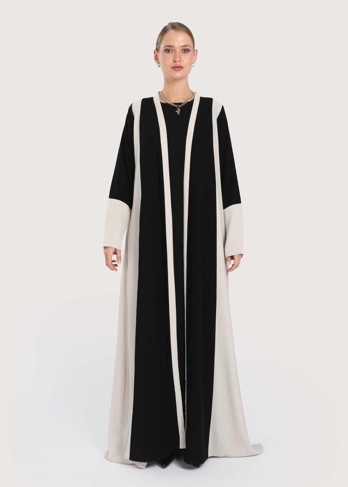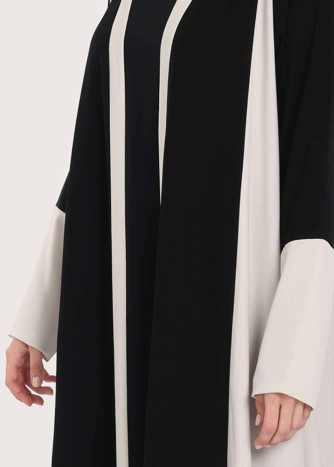- لون العباية: أسود كلون رئيسي مع جوانب وأكمام بلون بيج واضح.