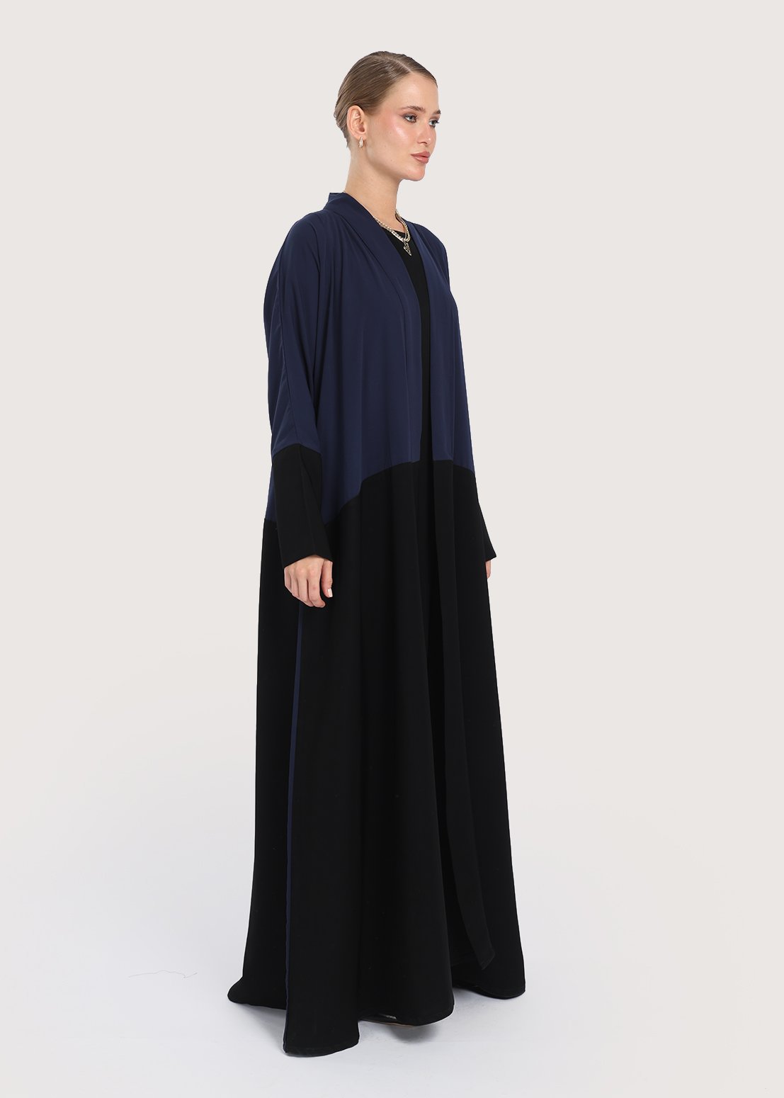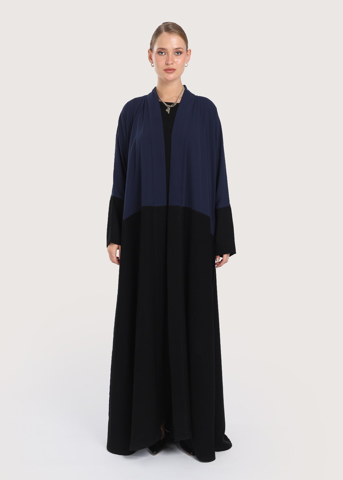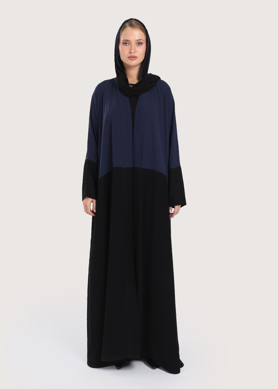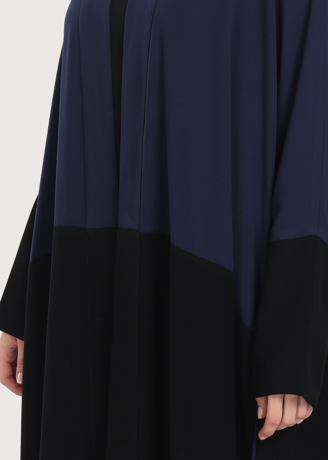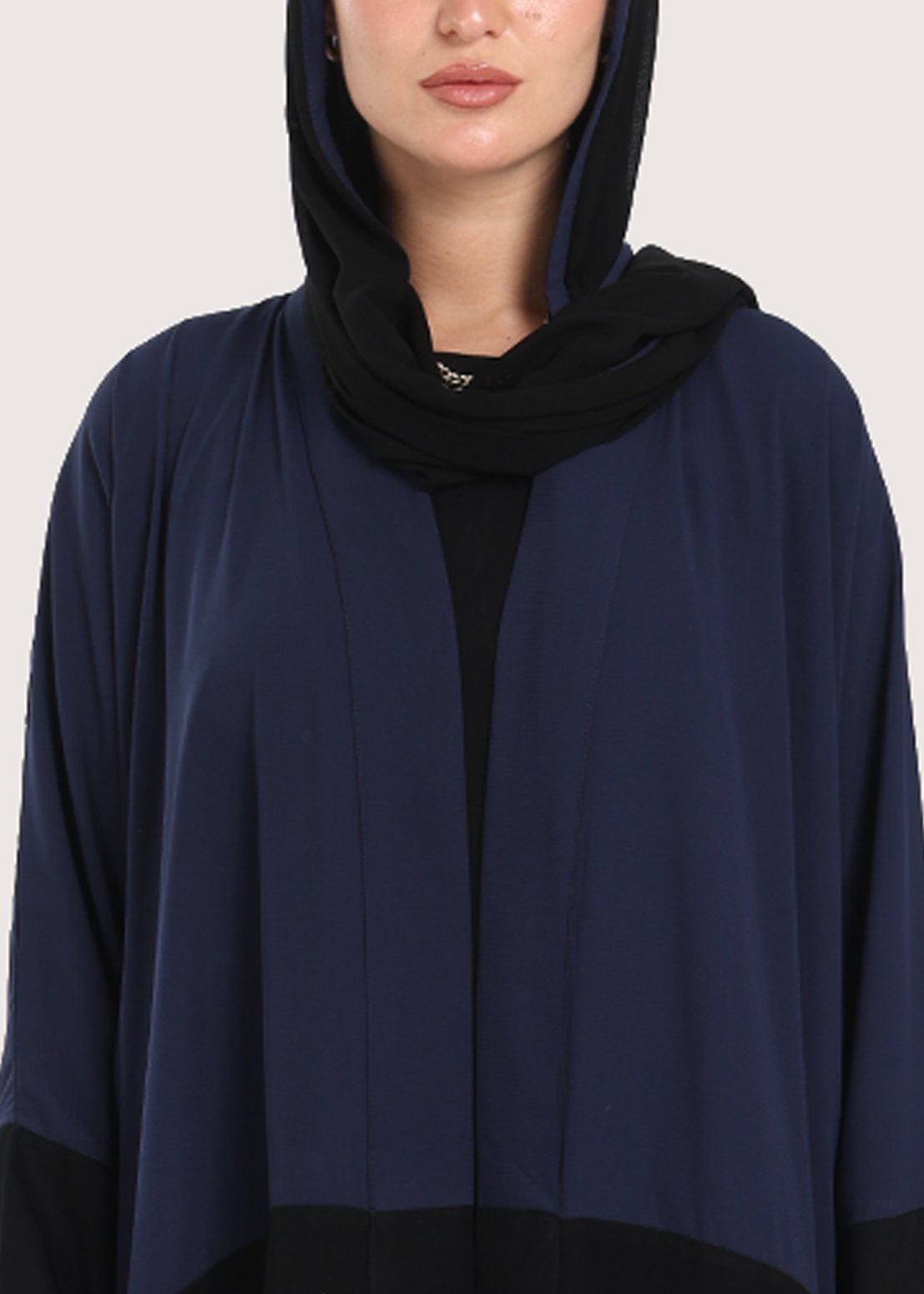 - تبرز هذه العباءة بمزيج اللون الكحلي الداكن والتفاصيل السوداء التي تضيف طابعاً كلاسيكياً محايداً.