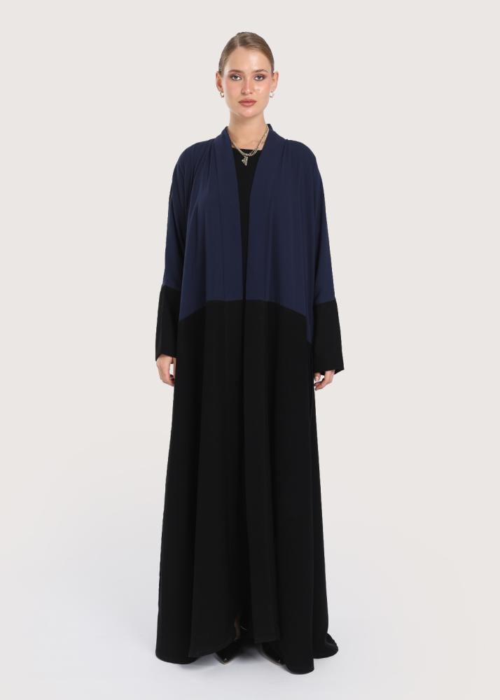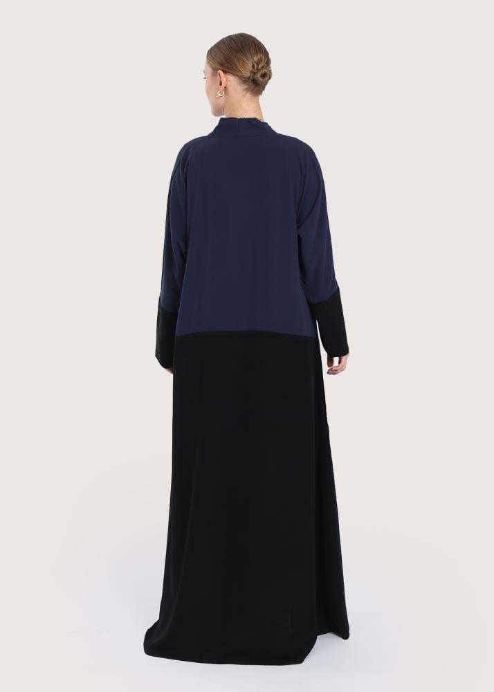• تبرز هذه العباءة بمزيج اللون الكحلي الداكن والتفاصيل السوداء التي تضيف طابعاً كلاسيكياً محايداً.