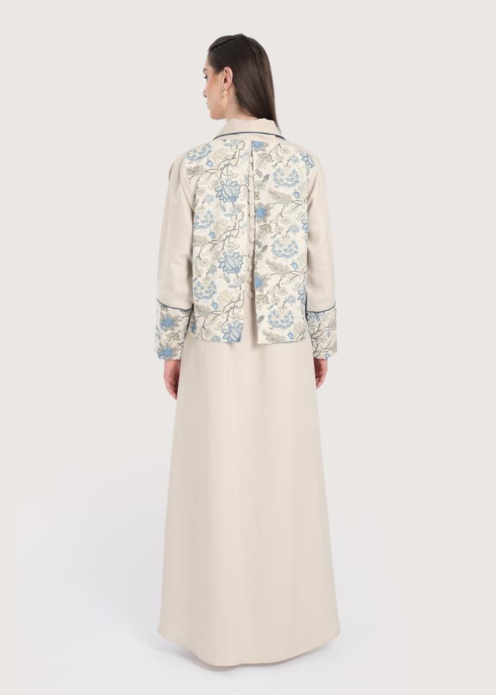 - اللون: بيج مع تطريز زهر أزرق على الأكمام والجوانب.