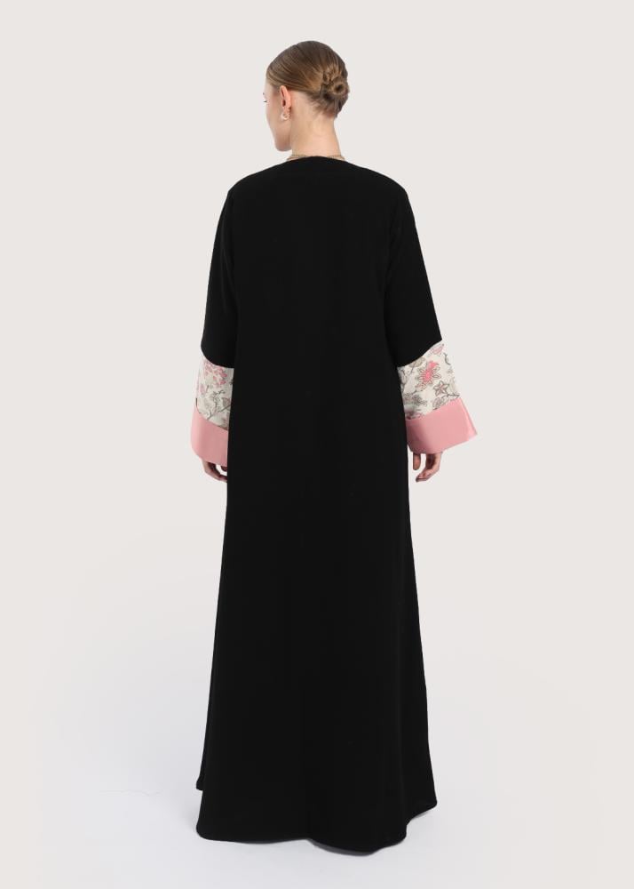 - اللون: أسود بتفاصيل زهرية وردية على الأطراف والأكمام.
