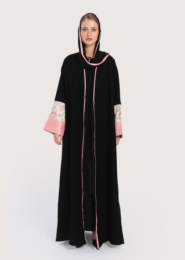 - الخط الأمامي الزهري في عبايات سوداء تطريز يضيف توازناً بصريًا يتميز بالأناقة والبساطة.