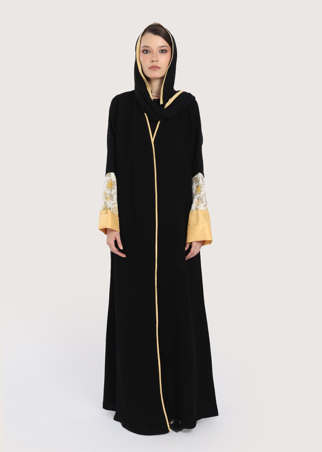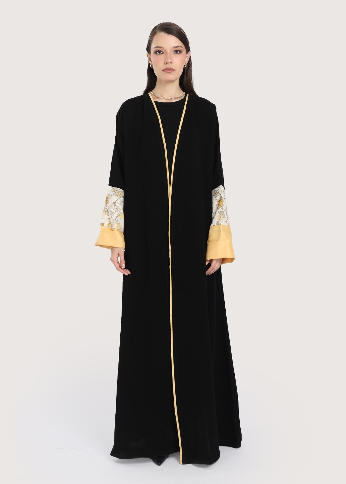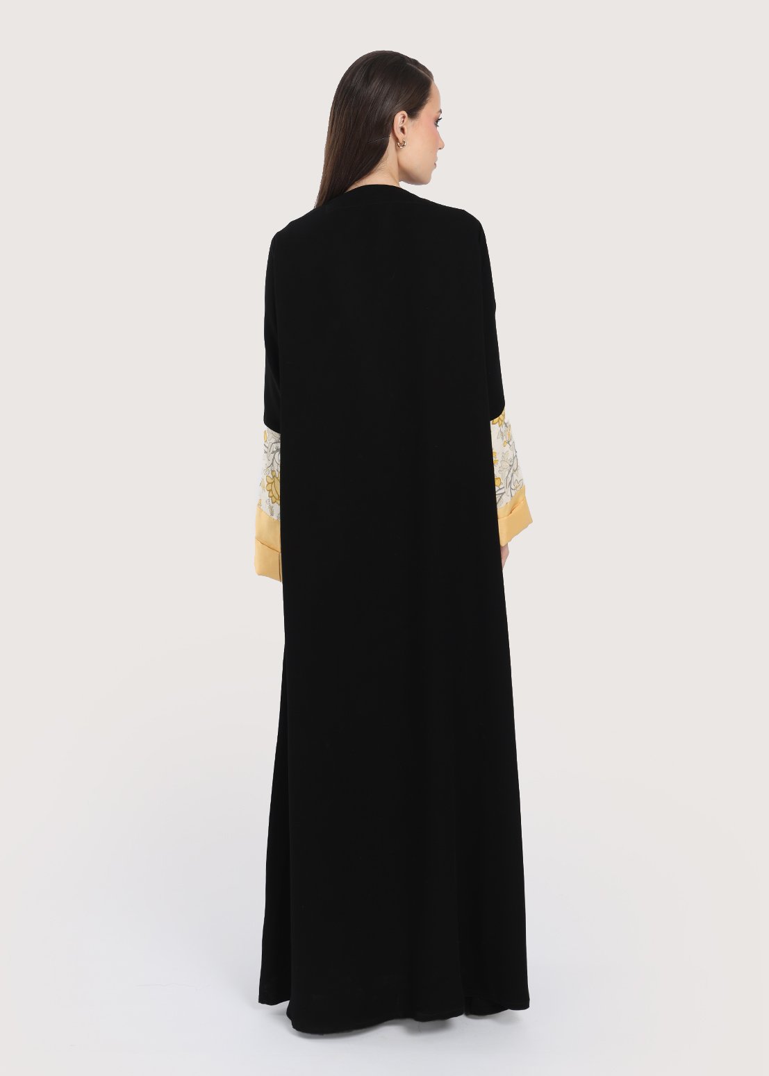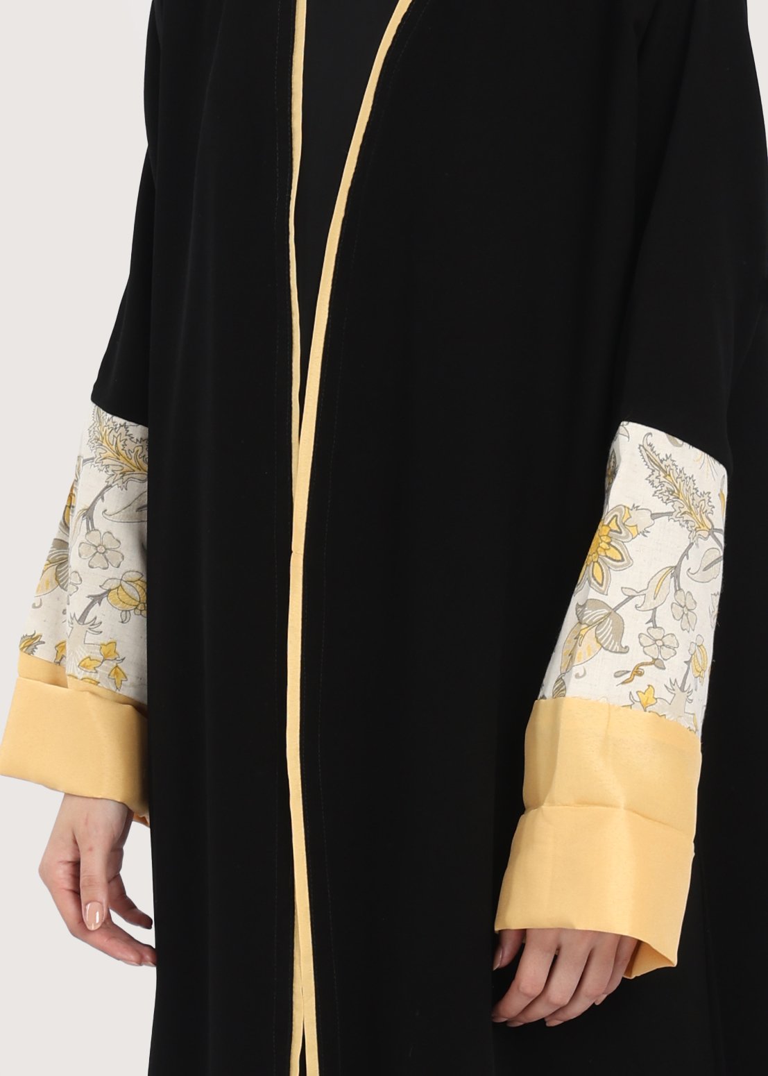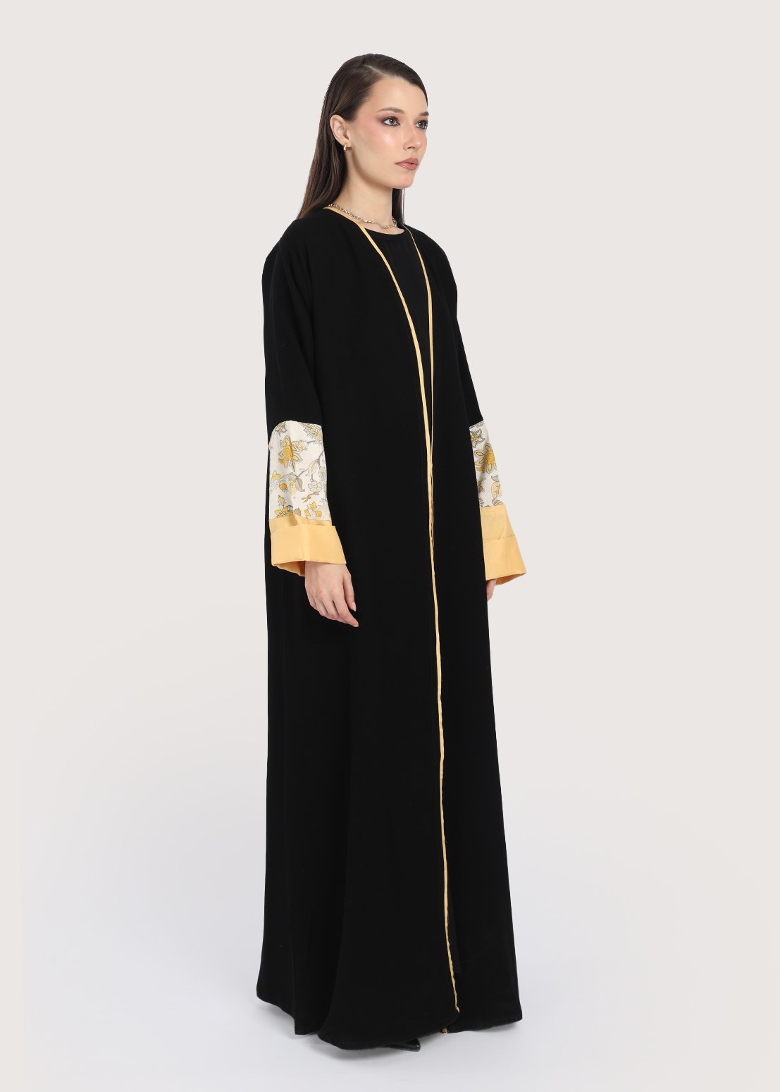 • اللون: سوداء مع تفاصيل زخرفية بالزهر الأصفر على الأكمام.