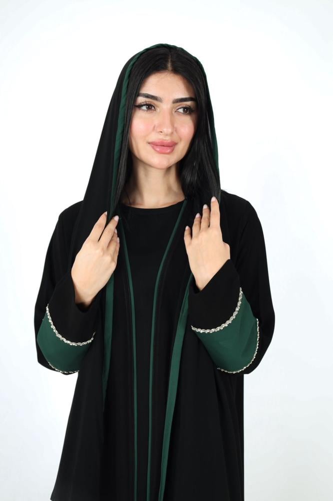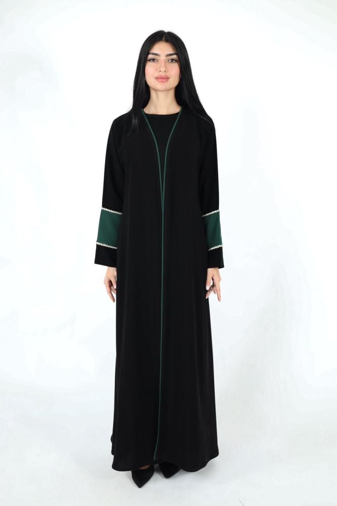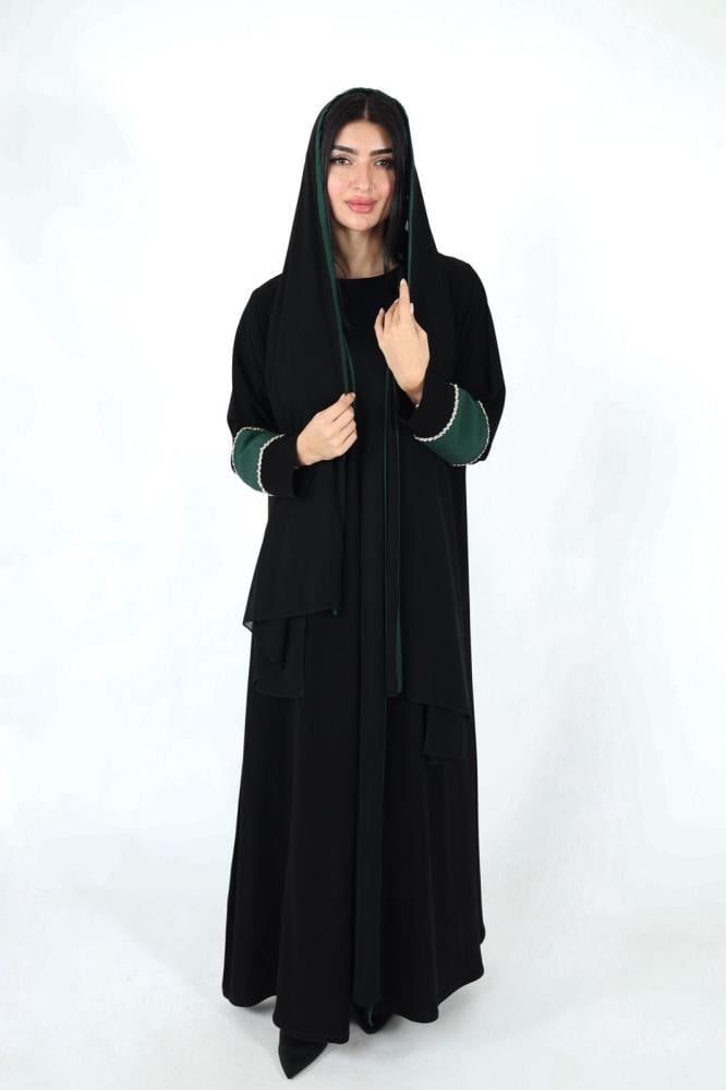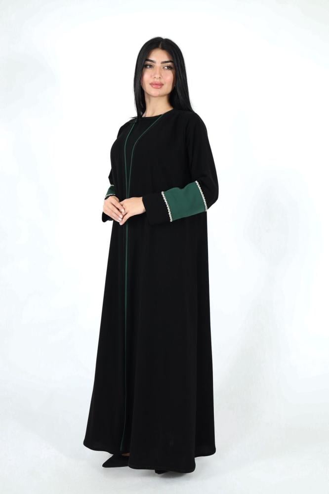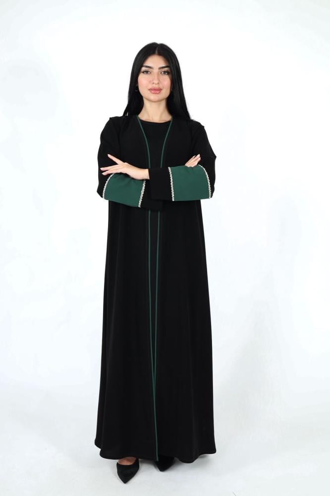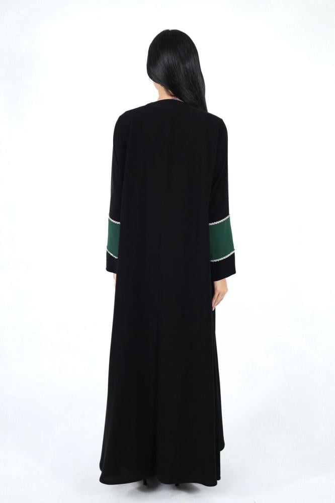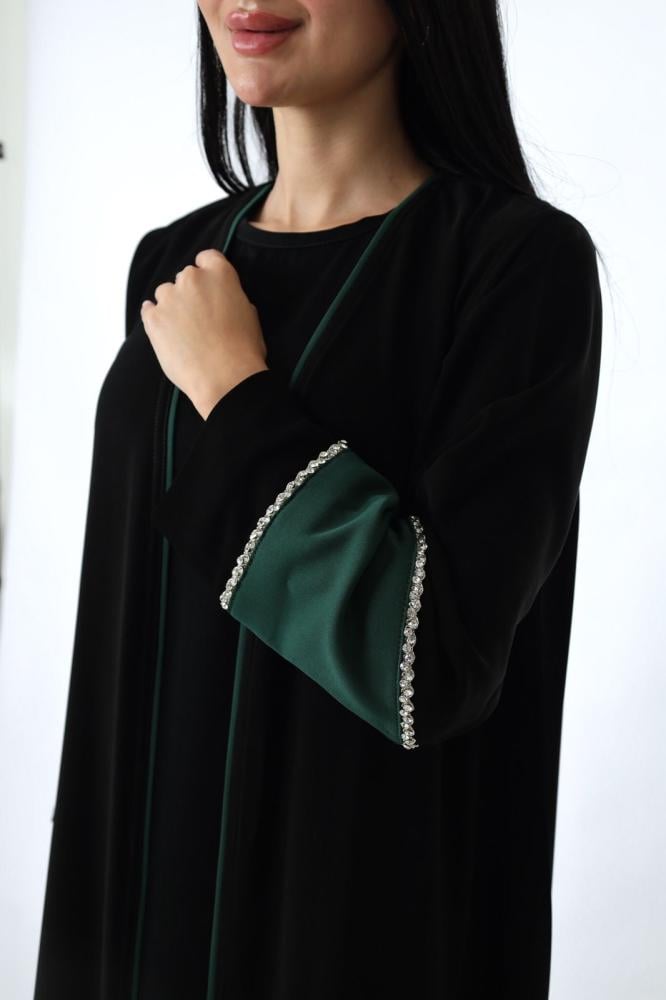 عباية سوداء مع لمسة من اللون الأخضر على الأكمام ،مزينة بكرستالات على الاكمام تجمع بين الأناقة والفخامة،
