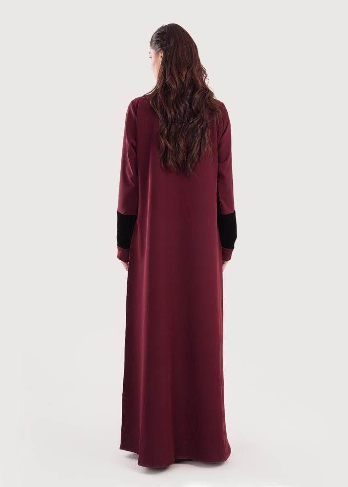 Shine with a sophisticated look with this luxurious burgundy abaya, crafted from high-quality crepe fabric with elegant black velvet inserts for a touch of luxury and distinction. Featuring a straight, slightly flared A-cut design, this abaya offers the perfect blend of elegance and comfort, making it a great choice for both special occasions and everyday outings.